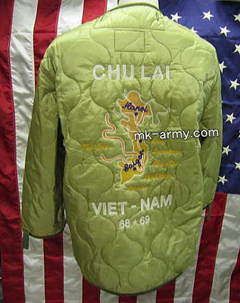 PEANUTS(ピーナッツ)社とHOUSTON社のコラボレーション!古着でも人気が有るベトジャン(ナイロンのマイクロリップ素材にひょうたんキルト)にスヌーピーのFLYING ACEの刺繍を入れました、前側の左胸にはベトジャンらしく「福」と右胸にはスヌーピーの相棒「ウッドストック」の刺繍を施しました。