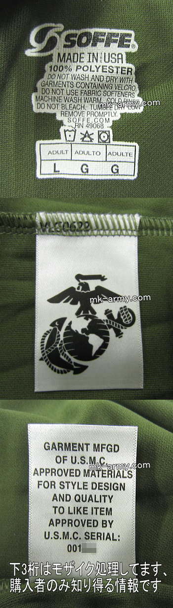 アメリカ海兵隊の承認品と同様(スタイル、デザイン、品質)のO.D.カラーTeeシャツ(素材は100%ポリエステル)です。もちろん耐久性も有りシリアル番号(001***下3桁は購入者のみ知り得る情報)も得てます。BDUユニフォームの下に着ても快適にフィットする様に設計されて、強化されたダブルステッチのクルーネックは洗濯しても型崩れしません。これ着てマリンコの様なマッチョマンに!