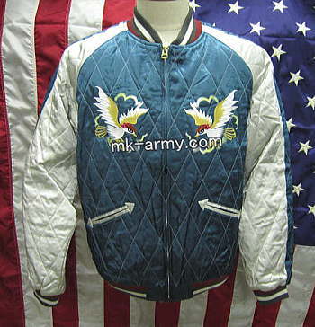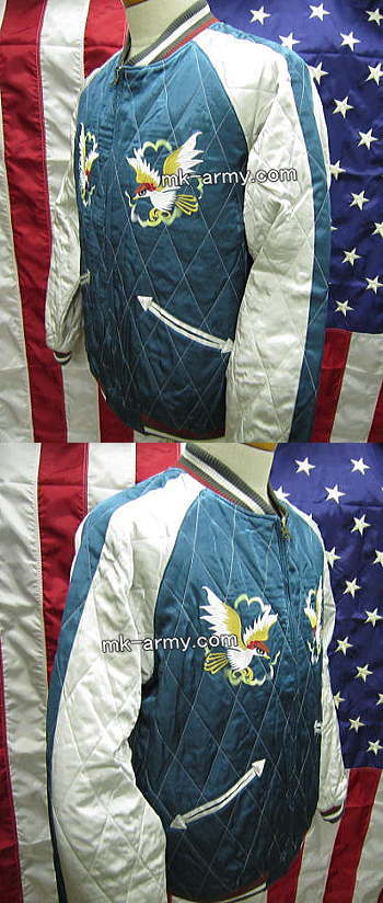 従来のスカジャンは刺繍がメインですが、これは刺繍とプリントを織り交ぜて表現しました。素材はレーヨンで手触り良し、古着でも余り見られないダイヤモンドキルティング仕様です。柄はスカジャンの定番「日本地図」。若い方よりも白髪まじりのチョイ悪オヤジに着て頂きたい一着です。ラグラン袖なので付け袖とは異なる着易さ。