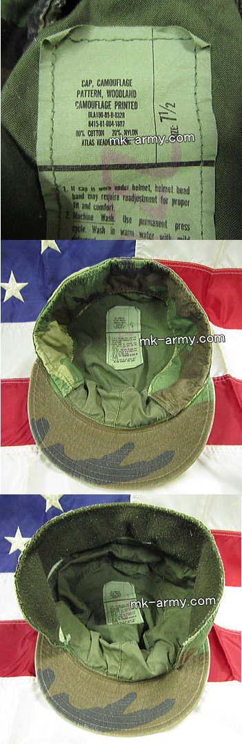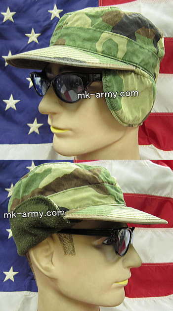 別名でパトロールキャップとも呼ばれてます。米軍よりお役御免に成った「ウッドランド・カモフラージュ」、しかし人気は衰えず現役バリバリ。勤勉な兵士が被った様でやや使い込んでます。帽子のツバは短め、お仕事でもストリートでも役に立ちます。耳当て(フリース素材で肌触りが良く、本当に暖かいです)は帽子の中に折り込んだり、外側に出したり。特技兵の記章が付いてます。サイズは日本人向きの約60cm(個々により被った感覚で若干異なります)。
