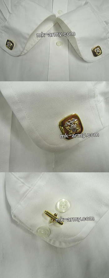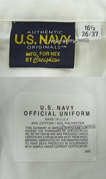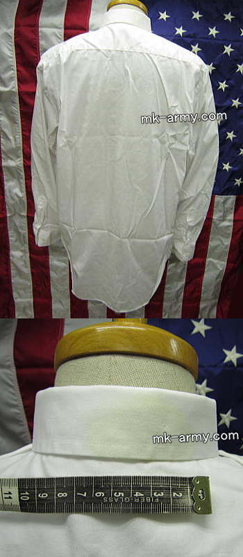 これを着用が出来るのはU.S.Navyの士官及びチーフペティーオフィサーからで、数少ないアメリカ海軍の長袖シャツ。シャツには肩章が付いてますのでソフト肩章がご使用可。素材はポリエステル40%綿60%で洗濯機で洗えます。袖口はカフスボタンも使用出来ます。襟の後ろ側に薄く黄ばみ汚れが見られます。