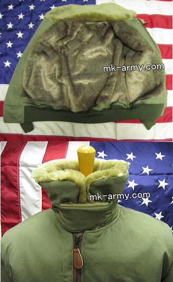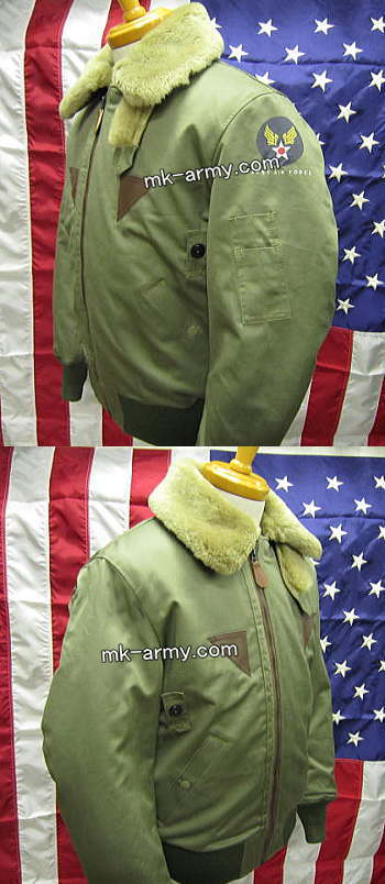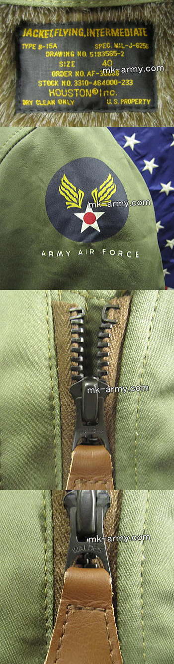 初期タイプのB15Aを忠実に再現しました。左右非対称、WALDES(ウォルディス)ジッパー、裏ボア(N-1デッキジャケットと同じ毛足が長いフカフカのボア)は袖の中まで入ってます、襟ボアはムートンリアルファ―で高級感が有ります(手触りが超〜気持ち良い)、デカールプリント(U.S.ARMY AIR FORCEの陸軍航空隊)、コットンヘビーサテン、表素材は綿なのでタバコで穴を開けて「アリャ」が有りません。ビンテージも良いのですが、実用で着るのならば忠実に再現したこれをお勧めします。