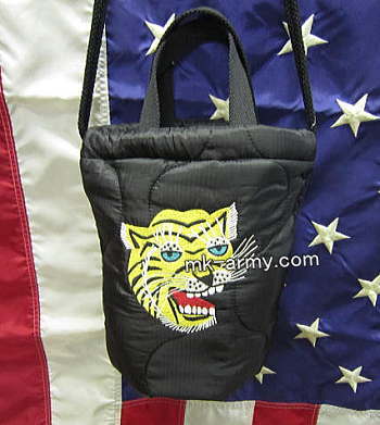 カタカナだとややこしい名前ですが「巾着袋」です。肩に掛ける様に紐を長くし、持ち手も付けてます。近年のスマホは大きく成りポケットに入りませんが、この巾着袋はキルティングなので大事なスマホを衝撃から守ってくれ出し入れが簡単。またお財布も楽に入ります。無地だと面白く無いので虎の刺繍です。