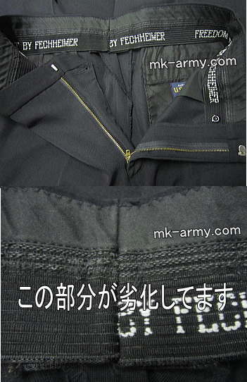 商品番号8657のパンツに成ります、バラ売りは不可。素材はウール&ポリエステルの混紡(フライングクロス社製)。太もも、ヒップ、お尻の辺りはゆったりとしたフィット感が有ります、膝から裾はストレートな仕上げ。前後には折り目が入ったフラットフロントスタイル。サイズは35Rでウエスト88cm股下79cm。内側のシャツずり上がりが劣化してます、股ズレ無しで未だ未だ現役!お洗濯はドライクリーニング。