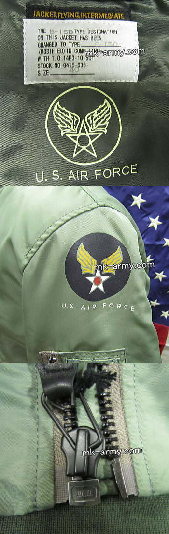 B-15Aのムートン襟ボアを取り外して改良したB-15Dモディファイを忠実に再現、黒タグの上から付加された白ラベルも再現してます。左袖にはU.S.AIR FORCEのステンシルプリントも忘れてません。アイデルジッパーを使用。MA-1フライトジャケットとほぼ変わらず見た目では識別が困難な位に良く出来てます。