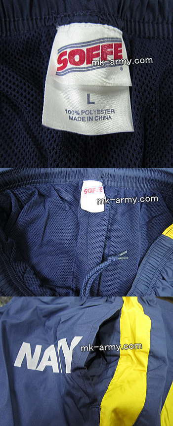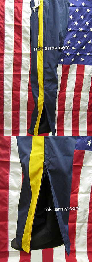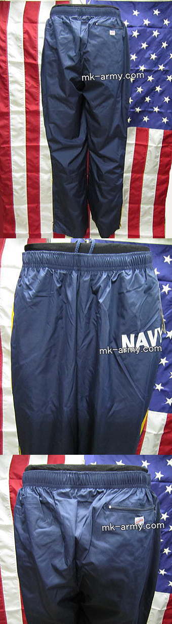ソフィー社の倉庫より試験的に作ったと思われる幻のアメリカ海軍PTパンツが入荷!NAVYのリフレクタープリント、両サイドに切り替え入り、両脇にはポケット付き。裾はジッパーで開閉が可能、膝位まで裏にメッシュ張り、防風、防水で透湿性が有ります。脇ゴム入りで78cm、伸ばすと104cm、股下80cm、これを履いて早朝のジョギングは如何でしょうか?