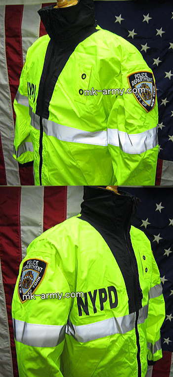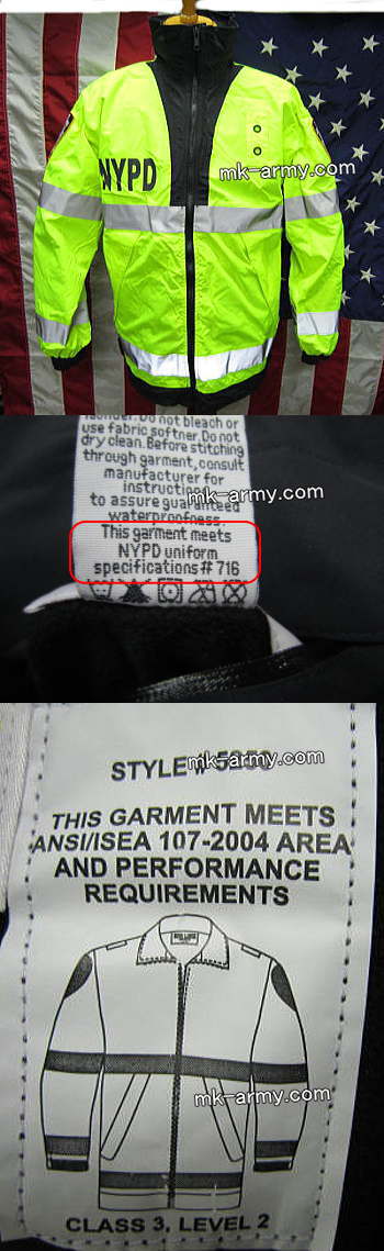 NYPDに納品(ANSI107-2010でクラス3、レベル2の認定を受けてます)している軽量化したレインコート(リバーシブルで着れます)です、実物(モノホン)のNYPDショルダーパッチが両面に付いてます。またNYPDの規格を満たした旨のタグも有ります。素材は100%防水ナイロンタクテルシェル/100%防水ポリエステルオックスフォードANSIライムLASD。防風性と通気性を兼ね備えて激しい雨やみぞれに耐える事が出来ます。米国モノは日本工業規格品の様なパーフェクトな仕上げを求む方は不向きです。