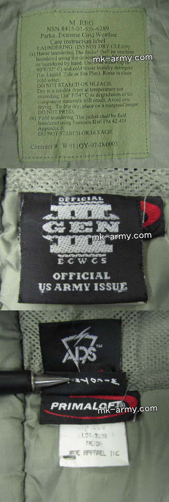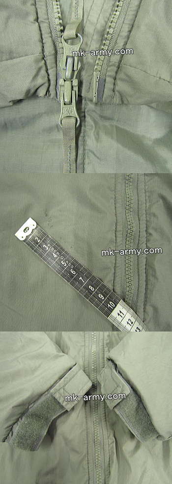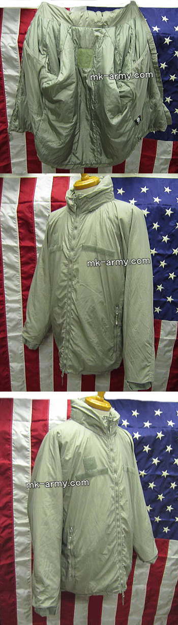 アメリカ陸軍ECWCS第三世代(ジェネレーション3)の防寒着です。PRIMALOFT(ダウンの約8倍の暖かさで、ダウンウェアと違い、羽が飛び出したり手入れに手間が係らない軽量でやわらかな風合い)を使用した、LEVEL7(極寒冷地防寒アウター)パーカーです、通称マシュマロスーツとも呼ばれてます。フードは襟に収納可能で、肘は補強されています。フロントはダブルジッパー仕様で、ジッパー開閉のサイドポケット内には裾を絞れるドローコードが付いています。