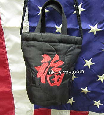 カタカナだとややこしい名前ですが「巾着袋」です。肩に掛ける様に紐を長くし、持ち手も付けてます。近年のスマホは大きく成りポケットに入りませんが、この巾着袋はキルティングなので大事なスマホを衝撃から守ってくれ出し入れが簡単。またお財布も楽に入ります。無地だと面白く無いので虎の刺繍です。