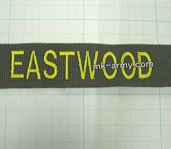 O.D.カラーのテープにオレンジ糸でお名前を弊店にて刺繍。刺繍文字(10文字目安で)は連絡事項等の欄(注文フォームの中頃に有ります)にご入力下さい。完璧を求める方には不向き。商品の特質上Noリターン&Noクレーム。別料金にて刺繍ソフトを使用しますとブロック体が可能、細かい事が出来るのでより良い刺繍。ミシンに直接入力はゴシック体のみ。ベルクロ縫付も別途料金、仕上げは13cm。